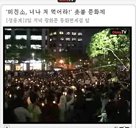 청계천 썸네일형 리스트형 5월 3일, 청계천에서 있었던 촛불문화제에 다녀오다! 청계천을 환하게 비쳤던 촛불의 모습 정부와 정치권은 이 촛불의 의미를 아는 걸까? 지난 5월 3일 토요일, 5월들어 2번째 있었던 촛불문화제에 참여하기 위해 시청역으로 향했습니다. 지하철 1호선 시청역과 2호선 시청역 사이 통로를 살펴보니 아래와 같은 안내지가 나와 있더군요. 아무래도 잘 모일 수 있도록 나름 배려를 한 흔적이 엿보입니다. ("다같이 쥐를 잡자"의 옛날 포스터를 패러디한게 인상적이더군요) 촛불문화제가 있는 곳으로 가보니 사람들이 여럿 있고, 경찰버스도 여럿 있었습니다. 피켓을 든 분도 여럿 있었으나 일반적인 시위에서 많이 볼 수 있던 깃발 같은건 별로 보이지 않았습니다. 파이낸스빌딩쪽에서는 진보신당에서 광우병 쇠고기 관련 서명을 받고 있었으며, 피켓을 들고 이야기하는 모습이 보였습니다. .. 더보기 MB는 성난 국민들의 목소리를 들을 것인가? 5월 2일 금요일, 청계천의 소라광장에서는 MB탄핵, 미국소고기 수입반대와 관련하여 촛불 시위가 있었습니다. 전 어떻게 될지 몰라 집에서 오마이TV를 통해 생중계로 지켜봤는데 수 만 명의 인파가 몰려 성난 국민의 모습을 여실히 볼 수 있었습니다. 위의 모습은 생방송을 마칠 쯤 보인 화면입니다. 내용을 타이핑해보면 "우리 어메리카는 개도 미국소는 안먹어. 우리 꼬리아에선 돈주고 시먹습니다" 라고 나와 있습니다. 이미 한 유력 외신에서 나온 뉴스기사가 인터넷을 통해 널리 공개된터라 위와 같은 메시지를 담지 않았나 싶습니다. 우리나라는 예전 광주민주화운동때처럼 언론 통제가 완전히 되지 못하는 상황이고, 인터넷에 익숙한 젊은 층을 중심으로 새로운 소식을 접하기 때문에 더 이상 숨기고 속이려고 하더라도 쉽지 않은.. 더보기 이전 1 다음